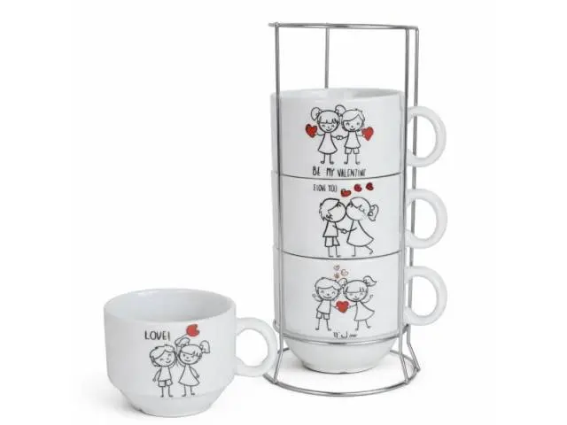 Set de tazas de San valentín con soporte.Incluye 4 tazas de cerámica y 1 soporte de metal.Medidas tazas: 7x6cm. / soporte: 20cm.